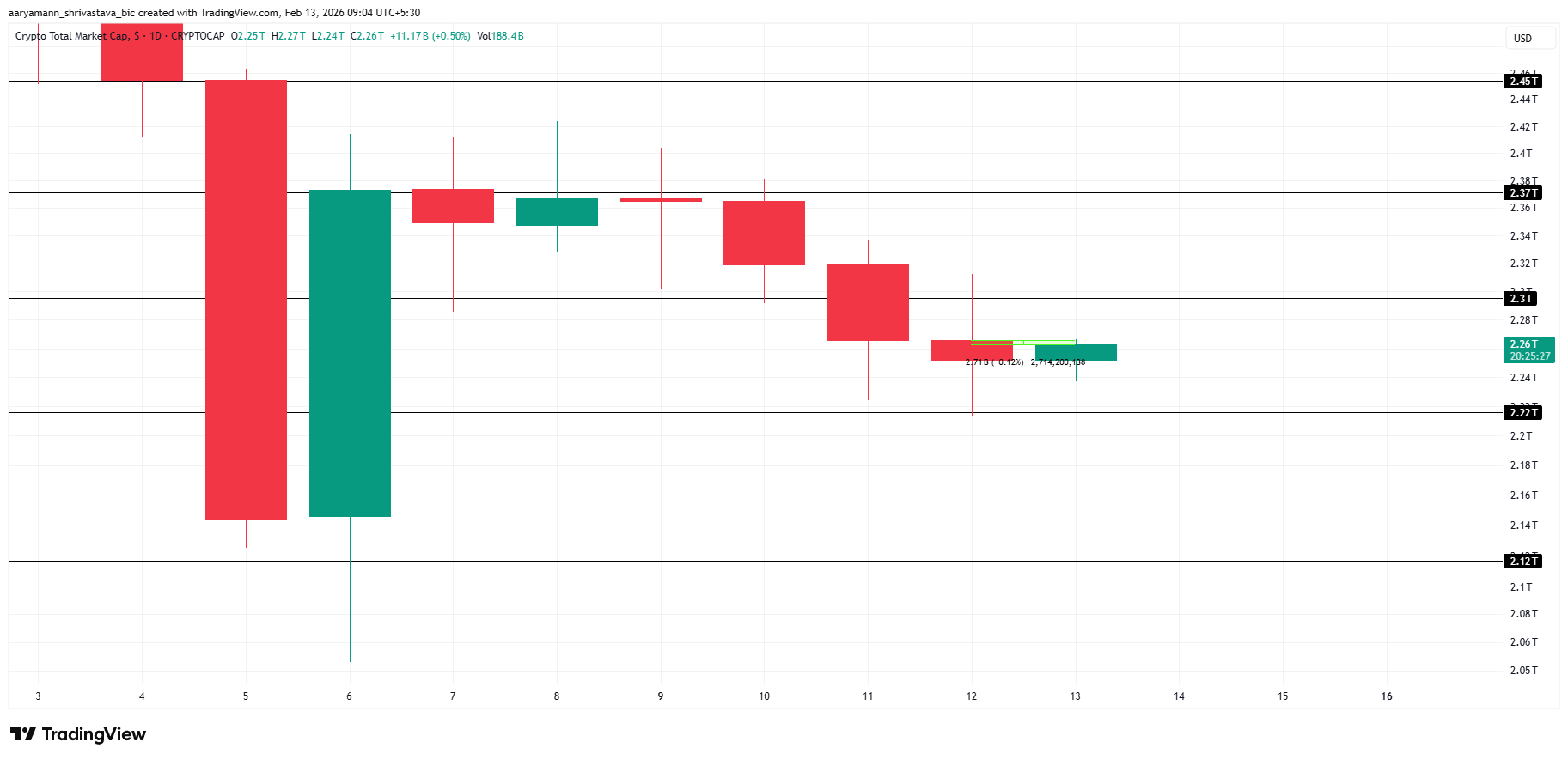 La capitalisation totale du marché crypto a reculé de 2,7 milliards de dollars, s’établissant à 2 260 milliards de dollars au moment de la publication. Le cours de TOTAL reste bloquée sous la résistance des 2 300 milliards de dollars. Ce plafond continue de limiter le momentum haussier alors que les investisseurs évaluent les conditions de liquidité et les signaux macroéconomiques plus étendus.