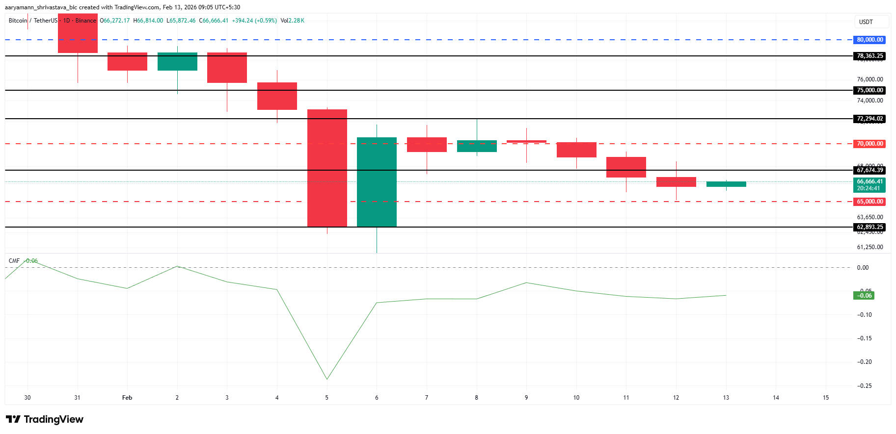 L’indicateur Chaikin Money Flow signale des sorties de capitaux persistantes sur Bitcoin. En effet, une pression vendeuse prolongée pourrait fragiliser le support des 65 000 dollars. Une cassure confirmée pourrait ainsi envoyer le BTC vers 62 893 dollars, voire plus bas, renforçant la perspective baissière actuelle sur l’ensemble du marché crypto.