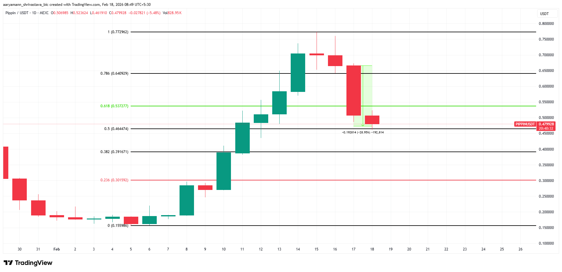 Après avoir enregistré des sommets historiques consécutifs, PIPPIN avait atteint 0,772 dollar avant de se retourner. La pression vendeuse soutenue a depuis entraîné cette correction. Les niveaux techniques indiquent un support proche de 0,391 dollar, avec un plancher plus profond autour de 0,301 dollar si l’élan baissier s’accélère.