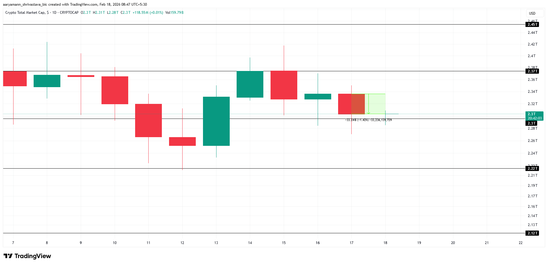La capitalisation totale du marché des cryptomonnaies (TOTAL) et le cours de Bitcoin (BTC) font toujours face à une pression baissière à l’approche de la seconde moitié de février. Pippin (PIPPIN) s’est par ailleurs imposé comme l’actif le moins performant de la journée avec une chute de 28 % en 24 heures.