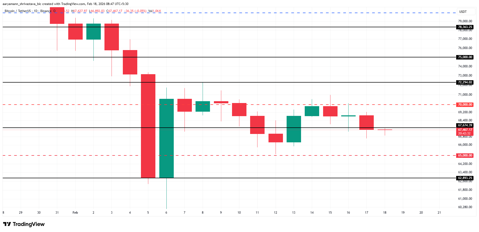 Le cours de Bitcoin évolue toujours dans un range, soit une fourchette, compris entre une résistance à 70 000 dollars et un support à 67 674 dollars. Le plancher plus large situé autour de 65 000 dollars continue de servir de zone de défense inférieure. Au moment de la rédaction de cet article, le BTC s’échange à 67 467 dollars, reflétant une indécision alors que les traders attendent des catalyseurs macroéconomiques ou institutionnels plus marqués.