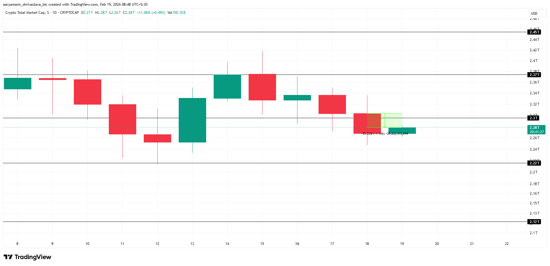 Cependant, une amélioration des conditions macroéconomiques pourrait modifier le sentiment. Une meilleure performance des marchés actions ou un retour des flux institutionnels pourraient soutenir un rebond. Un mouvement durable au-dessus des 2 300 milliards de dollars signalerait un regain d’intérêt acheteur. Le franchissement de ce seuil pourrait ouvrir la voie vers 2 370 milliards de dollars et restaurer un momentum plus large sur le marché crypto.