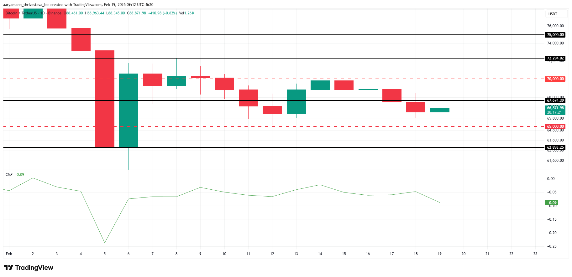 Le Chaikin Money Flow (CMF) reste sous la barre de zéro, soulignant des sorties de capitaux constantes et une demande au comptant modérée. Ce manque de flux entrants significatifs reflète un positionnement prudent aux niveaux actuels. À moins que les acheteurs n’interviennent avec conviction, la pression baissière pourrait ainsi s’accentuer, augmentant la probabilité d’un mouvement vers la base de support des 65 000 dollars ou vers le support des 62 892 dollars.
