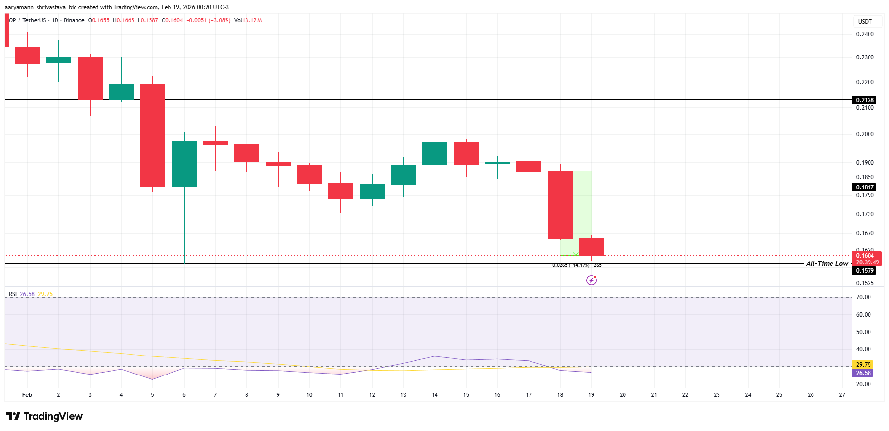 OP s’impose comme l’altcoin le plus mal classé de la journée, avec une chute de plus de 14,7 % au cours des dernières 24 heures. Le token se négocie à 0,1604 $, toujours proche de son creux historique de 0,1579 $. La pression de vente persistante reflète un sentiment baissier accentué sur l’ensemble du marché des cryptomonnaies.