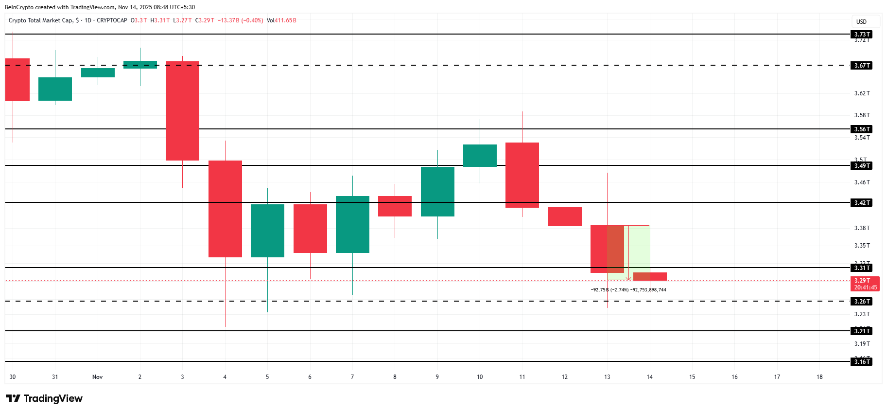 Un rebond devient envisageable si les signaux du marché s’améliorent et que TOTAL rebondit à partir de 3,26 billions de dollars. Une progression vers 3,31 billions de dollars pourrait alors ouvrir la voie à 3,42 billions de dollars. Si la barre de 3,26 billions de dollars cède, la prochaine cible est 3,21 billions de dollars, ce qui pourrait prolonger la pression à la baisse sur les principaux actifs numériques.