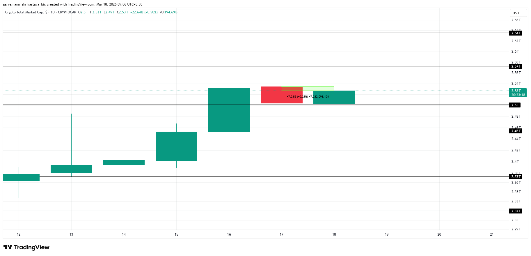 La prudence des investisseurs à l’approche de la réunion du FOMC du 28 mars entraîne une légère tendance baissière à court terme. Historiquement, l’incertitude précédant les décisions de la Fed provoque des phases de consolidation temporaires plutôt que des replis prolongés. Une fois plus de clarté apportée par la réunion, un regain de confiance pourrait permettre à la capitalisation totale de dépasser la résistance des 2 570 milliards de dollars et de prolonger la reprise en cours.