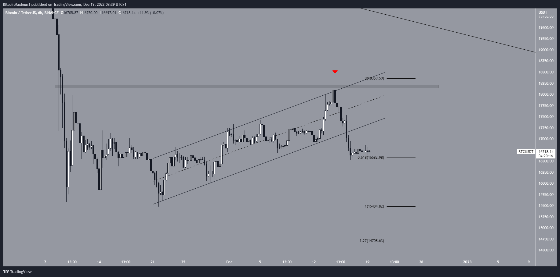 Après avoir atteint un sommet de 18 387 $ le 14 décembre, le prix du BTC a rapidement chuté et s’est détaché du canal deux jours plus tard. Actuellement, il se maintient à peine au-dessus du niveau du retracement Fib de 0,618 à 18 580 $.