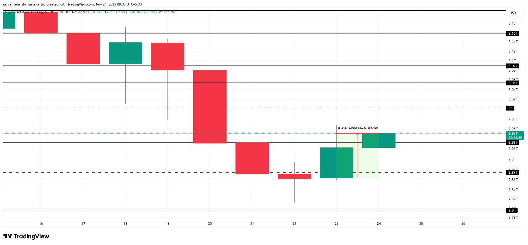 La capitalisation totale du marché des cryptomonnaies a augmenté de 88 milliards de dollars au cours des dernières 24 heures. Son cours a atteint 2,95 billions de dollars après avoir réussi à convetir le niveau de 2,93 billions de dollars en support. Ce changement signale un regain de confiance et les premiers signes de stabilisation après une période de forte volatilité parmi les principaux actifs numériques.