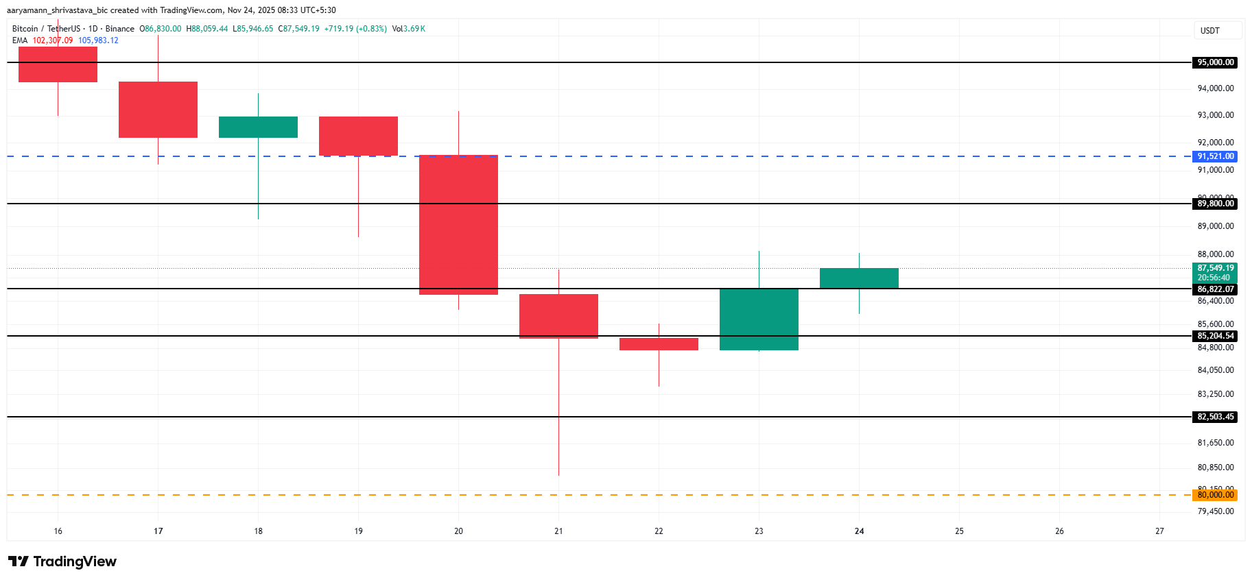 Bitcoin s’échange actuellement à 87 549 $ et se maintient au-dessus du niveau de support clé de 86 822 $, en plus de tenter un rebond. Le roi des cryptomonnaies montre ainsi des signes précoces de reprise, et les traders surveillent maintenant un possible mouvement vers la zone des 90 000 $ tandis que le sentiment général s’améliore lentement.