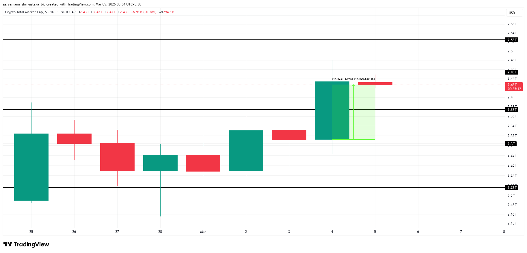 Si la dynamique haussière se poursuit, davantage d’entrées de capitaux sont attendues, ce qui ferait grimper la valeur des différents tokens. Cela pourrait propulser la capitalisation totale du marché (TOTAL) au-delà de 2,45 billions de dollars, avec un potentiel d’atteindre 2,53 billions de dollars. Une confiance durable des investisseurs pourrait alimenter davantage cette tendance à la hausse.