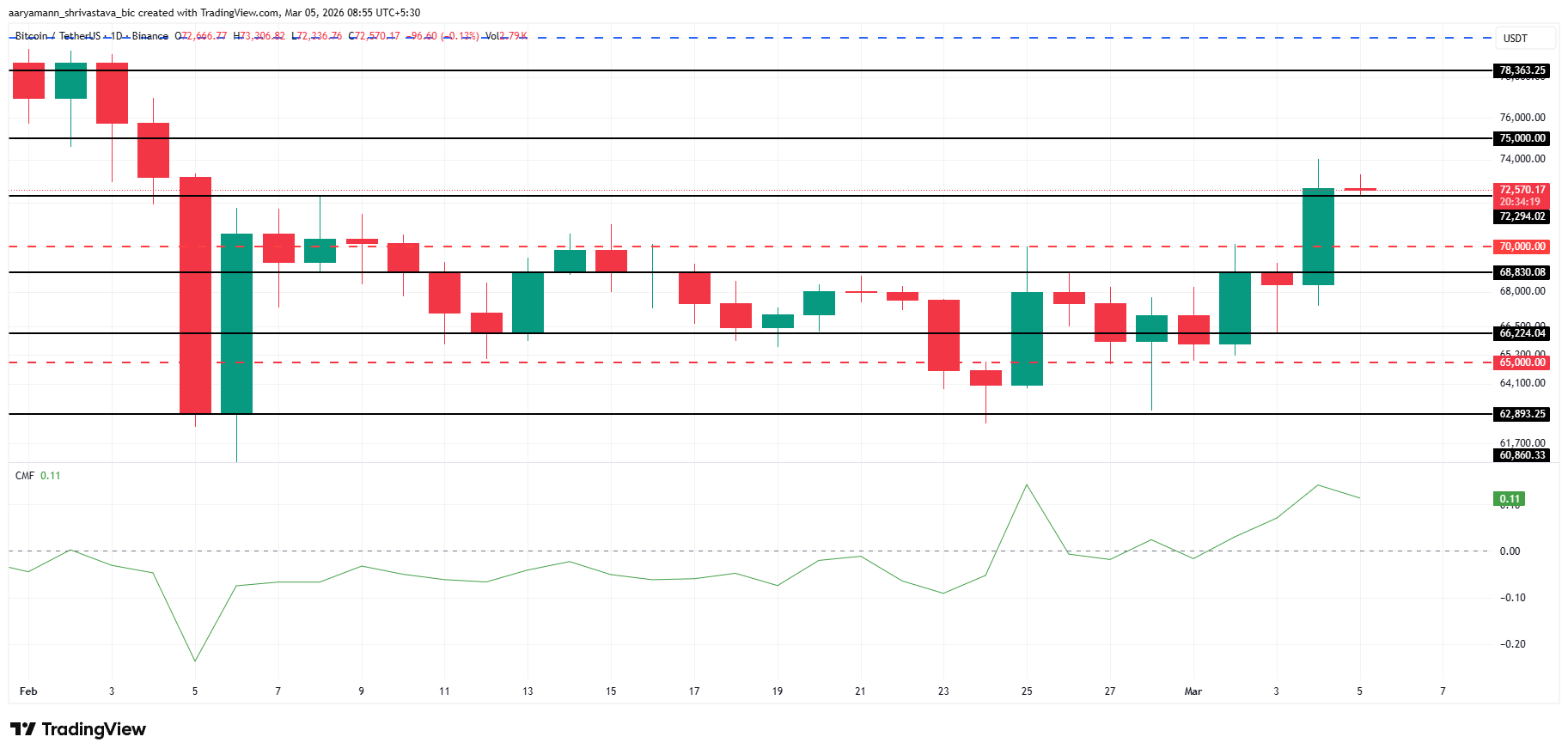 Le cours de Bitcoin devrait bénéficier d’importants flux d’investissement, l’indicateur Chaikin Money Flow (CMF) affichant une hausse en territoire positif. Cette pression acheteuse pourrait pousser le BTC au-delà du seuil des 75 000 dollars, à condition que les conditions de marché restent favorables. La dynamique actuelle suggère un potentiel de progression supplémentaire.