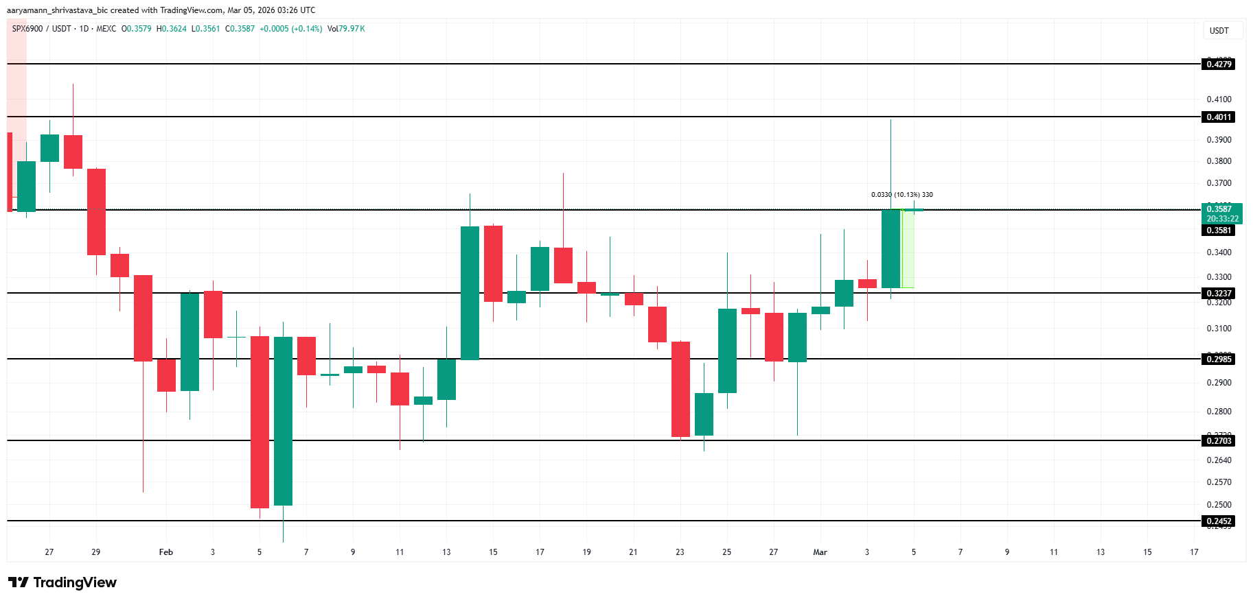 SPX s’est imposé comme l’altcoin le plus performant de la journée, avec une progression de 10 % pour atteindre 0,358 dollar au moment de la rédaction de cet article. Le meme coin a brièvement grimpé jusqu’à 0,401 dollar au cours de la séance intrajournalière, mais n’a pas réussi à maintenir ce niveau. Néanmoins, la dynamique générale reste positive, suggérant un potentiel de gains supplémentaires pour SPX.