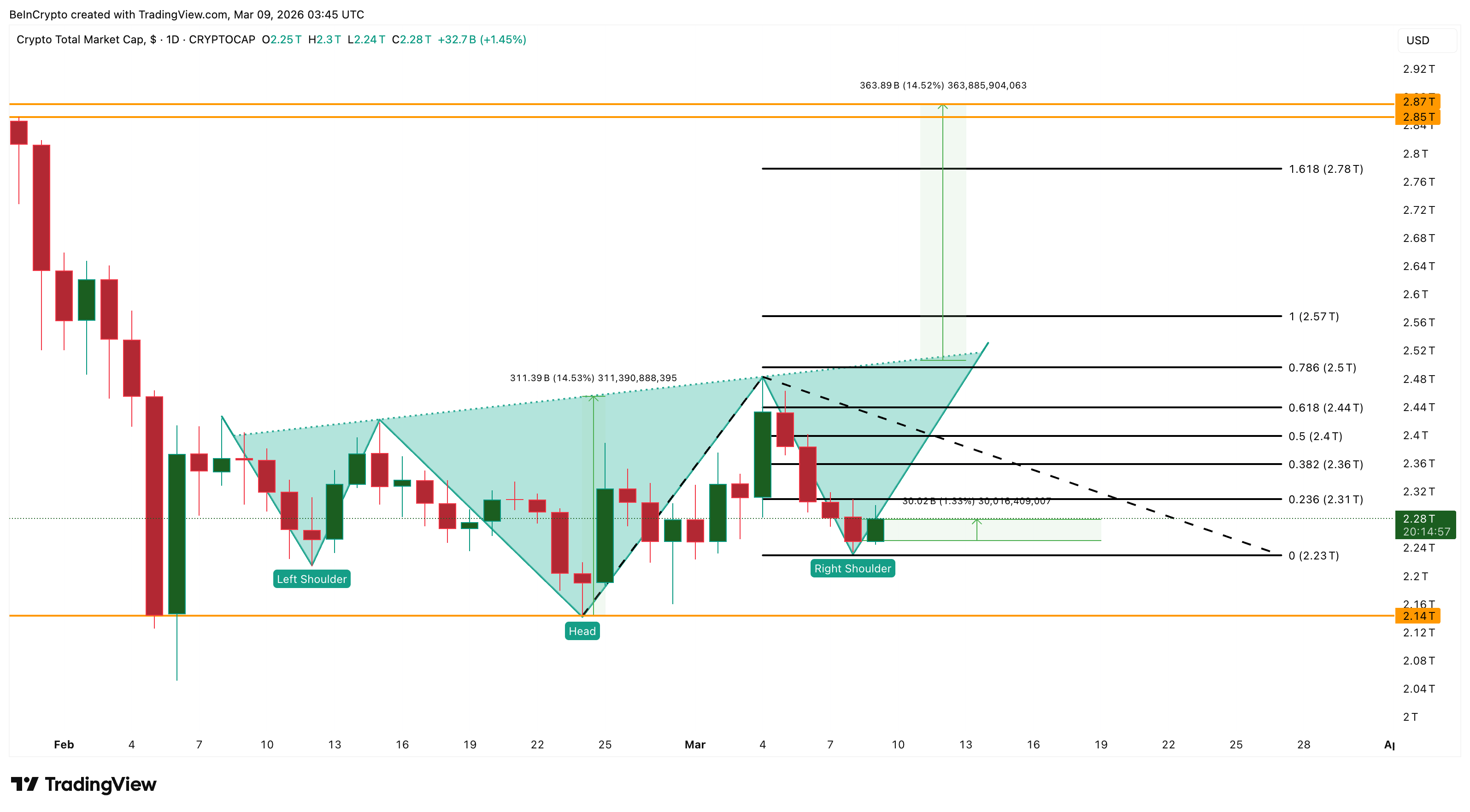 La capitalisation totale du marché crypto, TOTAL, montre de premiers signes de vigueur. Depuis la clôture de la précédente bougie quotidienne, le marché a progressé d’environ 1,33 %, gagnant près de 30 milliards de dollars, ce qui porte sa valorisation globale à environ 2,28 billions de dollars au moment de la rédaction de ce rapport. Il est à noter que cette hausse a lieu alors que Bitcoin évolue globalement à plat, ce qui suggère que la structure plus générale du marché pourrait être à l’origine du mouvement.