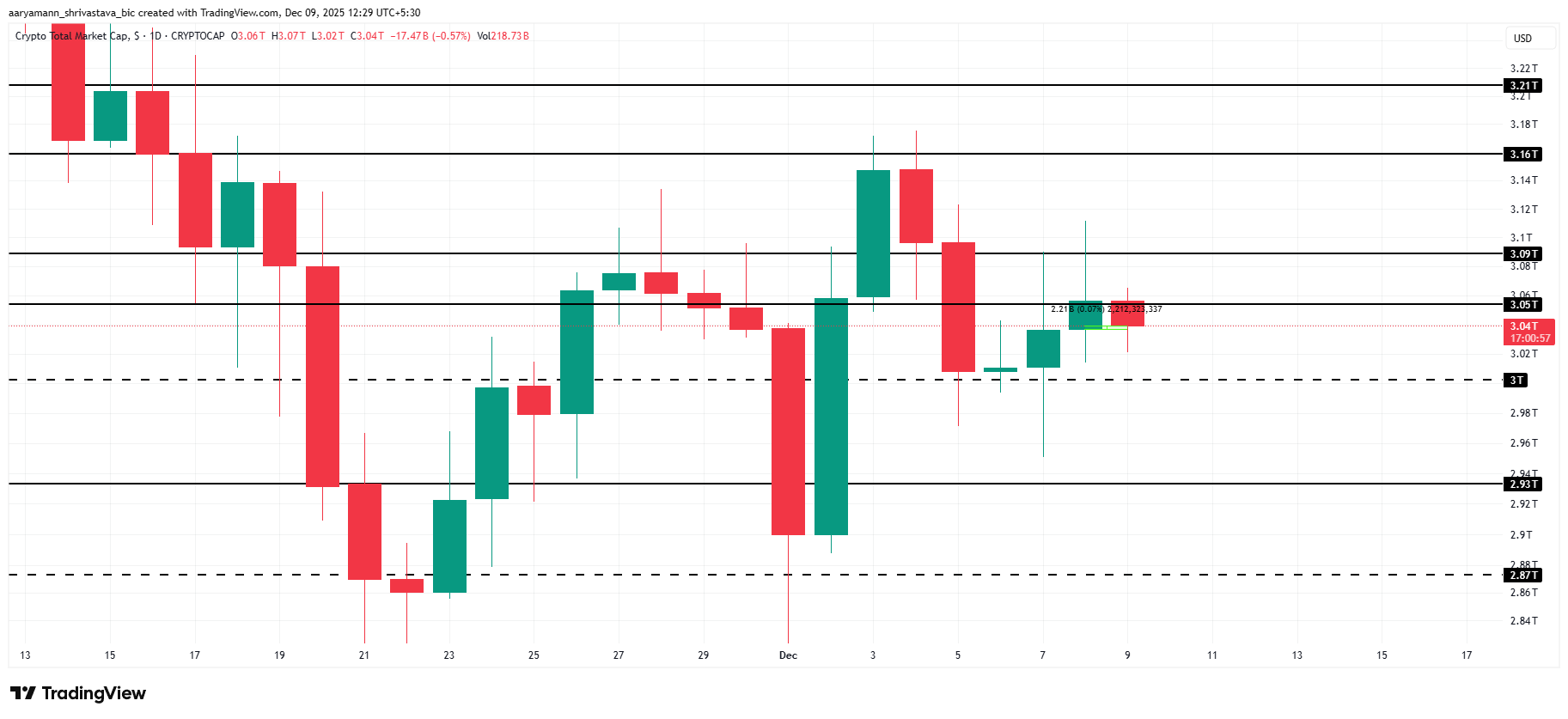 L’approche de la réunion du FOMC, prévue ce mercredi 10 décembre, contribue probablement à stabiliser le marché crypto. Ainsi, si la baisse de 25 points de base du taux d’intérêt est confirmée comme prévu, TOTAL pourrait grimper à 3,09 billions de dollars ou davantage.