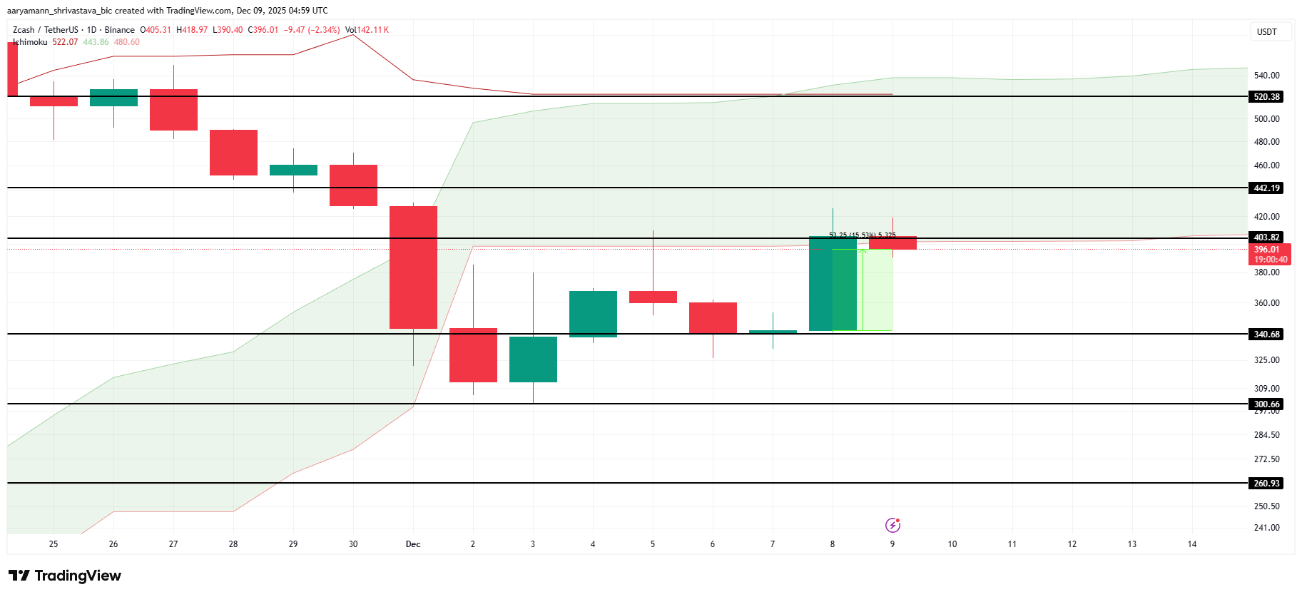 Le cours du ZEC a augmenté de 15,5 % au cours des dernières 24 heures, atteignant 396 $ après avoir rebondi sur le support des 340 $. L’altcoin se négocie désormais juste en dessous de la résistance critique des 403 $, où une cassure pourrait déterminer son prochain mouvement majeur.