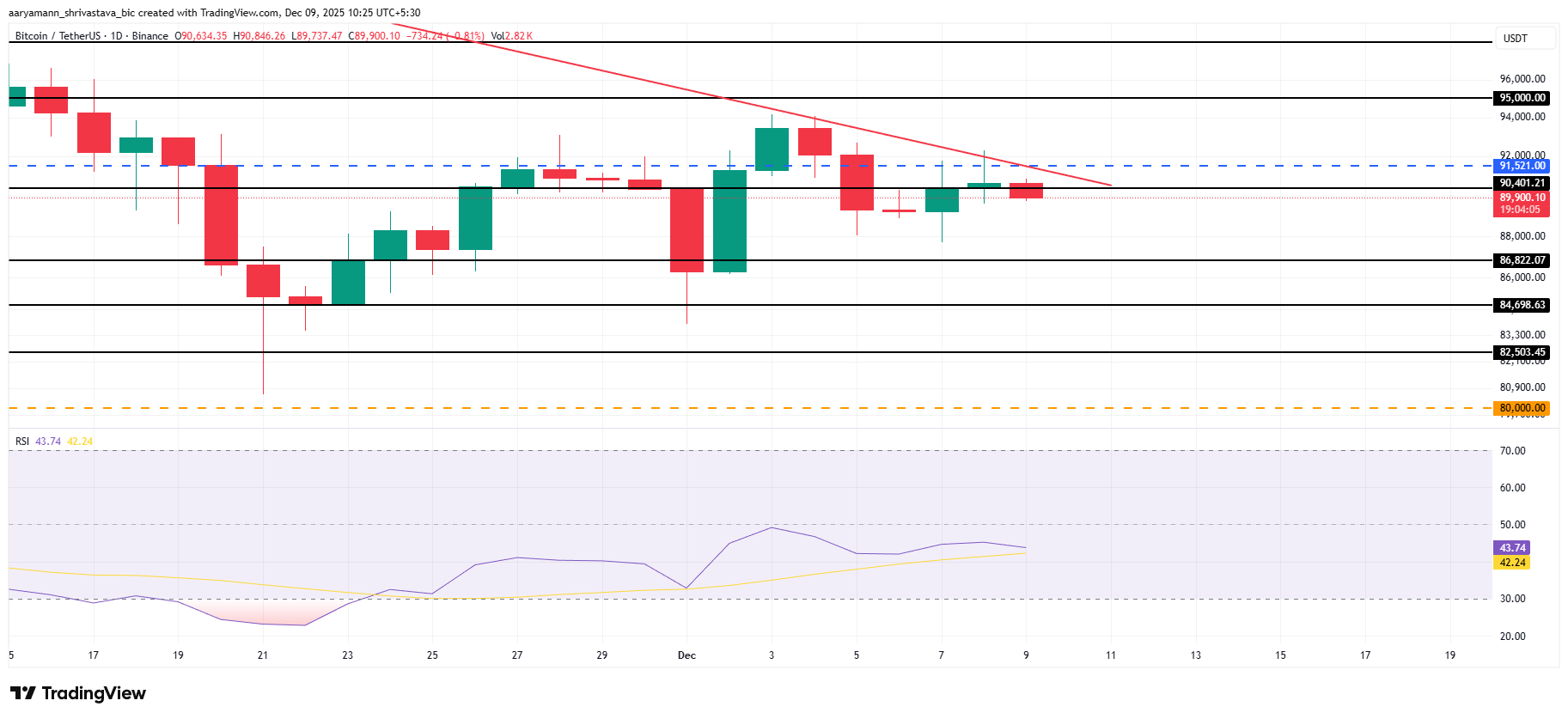 Le cours de Bitcoin n’a affiché aucune hausse sur les dernières 24 heures et se négocie actuellement à 89 900 $ au moment de la rédaction. Le roi des cryptomonnaies continue de faire face à la tendance baissière active depuis la fin octobre, laquelle a limité les mouvements haussiers tout au long de la semaine.