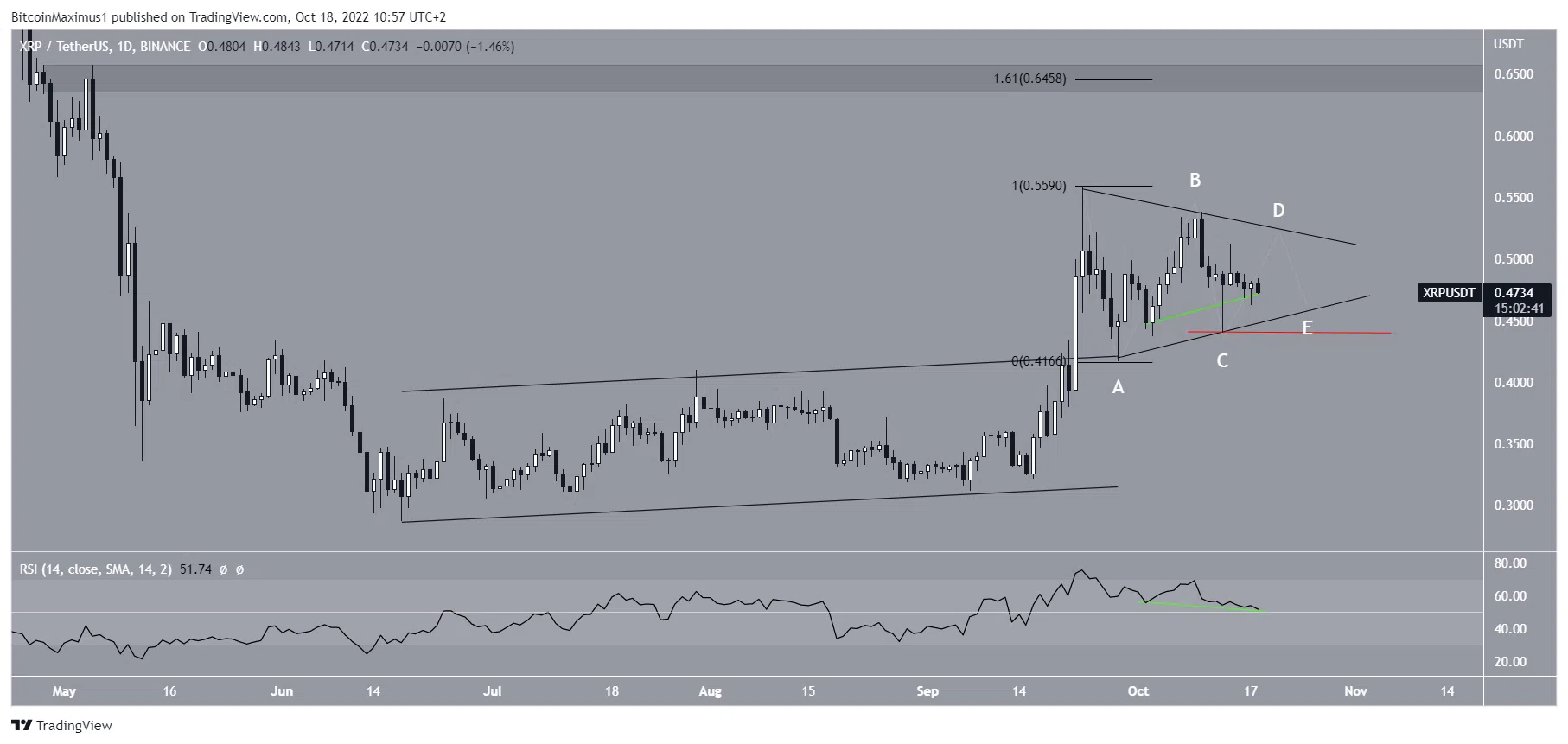 Une baisse sous le plus creux de la vague C, situé à 0,44 $ (ligne rouge) annulerait cette possibilité et indiquerait que le cours du XRP se trouve plutôt en phase de correction.