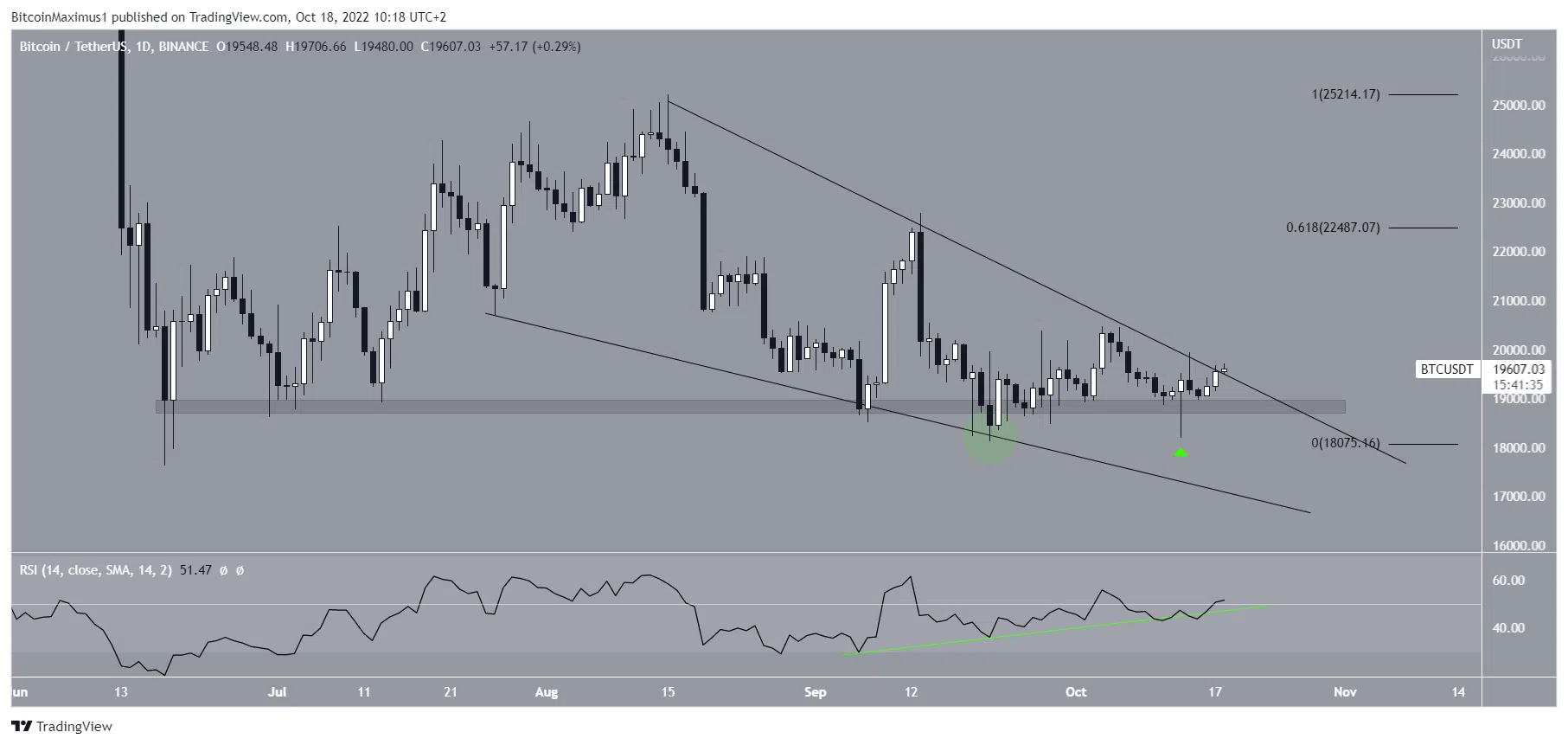 De plus, Bitcoin a créé une figure de chandelier en marteau haussier le 13 octobre (flèche verte), ce qui soutient davantage la possibilité d’une avancée.