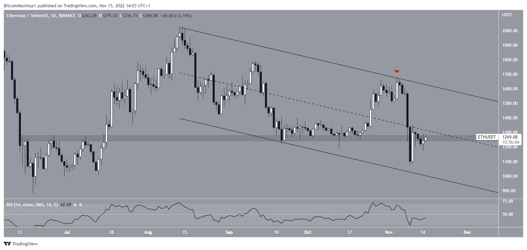 Le cours de l’ETH a diminué au sein d’un canal parallèle descendant depuis le 14 août. L’actif a été rejeté par sa ligne de résistance le 4 novembre et a atteint un creux de 1 073 $ cinq jours plus tard. Depuis, le cours a augmenté et cherche à reconquérir la zone horizontale des 1 260 $.