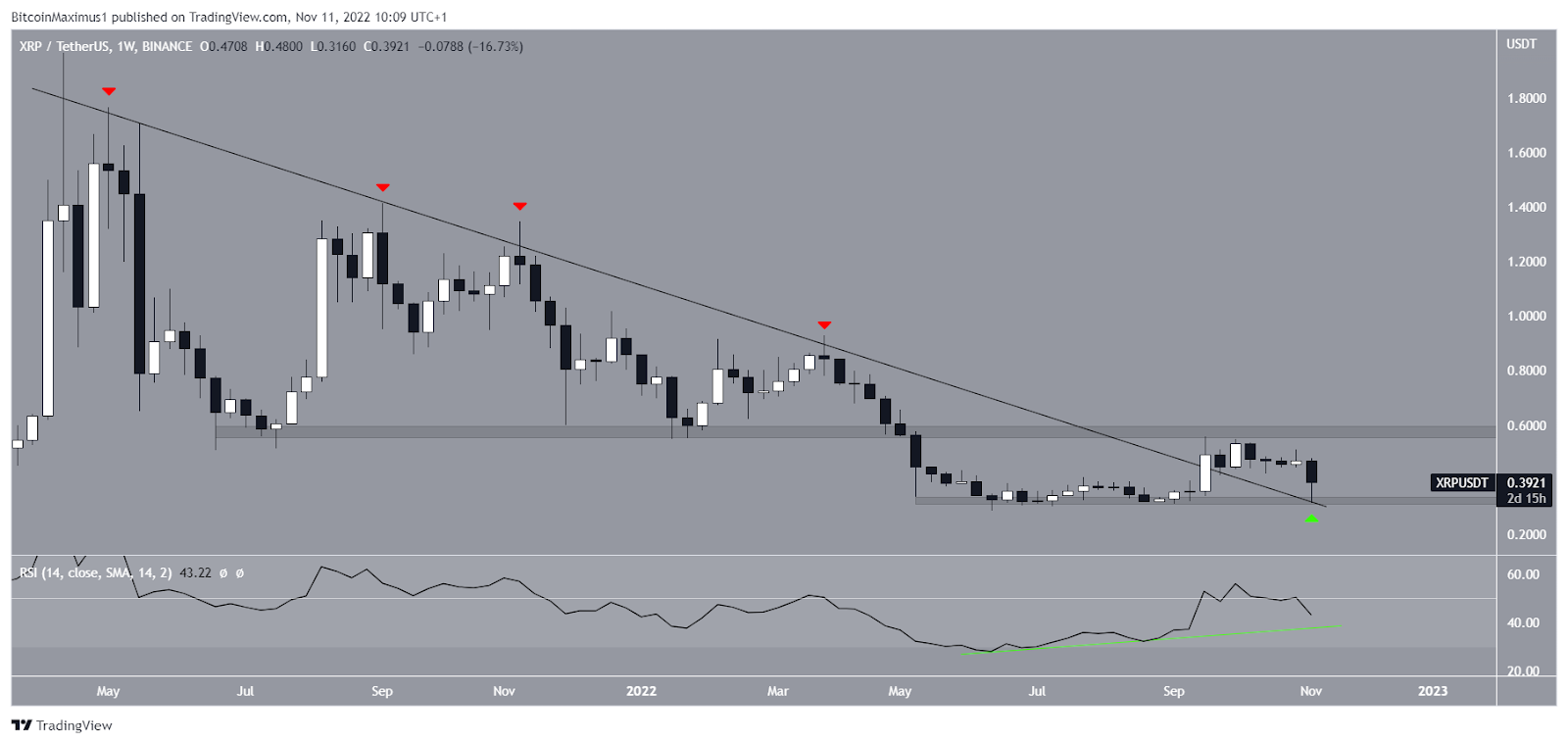 L’action du cours XRP au sein du graphique quotidien montre que l’actif décline sous une ligne de résistance de long terme depuis avril 2021. Il a tenté de la dépasser à quatre reprises, sans succès (flèches rouges), avant de chuter à un creux de 0,28 $.