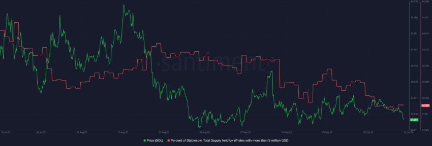 Malgré le contexte baissier et le déclin du cours, les baleines et les grandes entités montrant une accumulation saine de cryptos jouent souvent en faveur des altcoins. Pour Solana, cependant, l’offre totale de stablecoins détenue par les baleines, avec plus de 5 millions d’USD, a suivi une tendance à la baisse de long terme. Ainsi, moins de baleines disposent des fonds suffisants pour provoquer d’importants mouvements de prix.