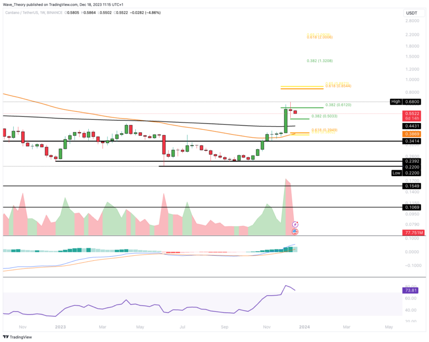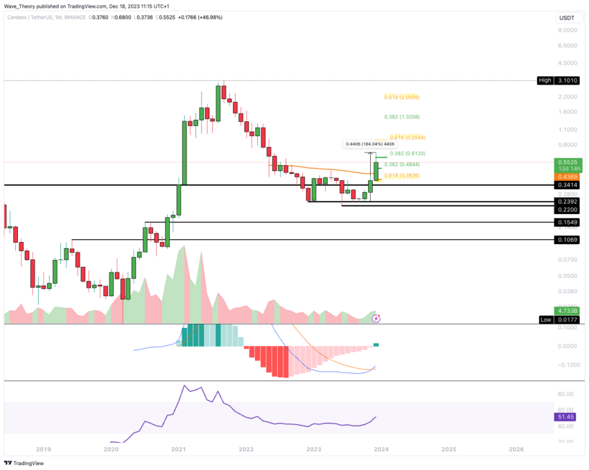 SponsoredCe mouvement correctif est mis en évidence par la difficulté du Cardano à franchir la résistance au niveau de 0,382 Fibonacci (Fib). Ce niveau se situe aux alentours de 0,612 $. Malgré cela, le graphique mensuel montre des signes haussiers : l’histogramme des moyennes mobiles de convergence et de divergence (MACD) s’oriente constamment vers le haut, et les lignes MACD se sont croisées de manière haussière.
