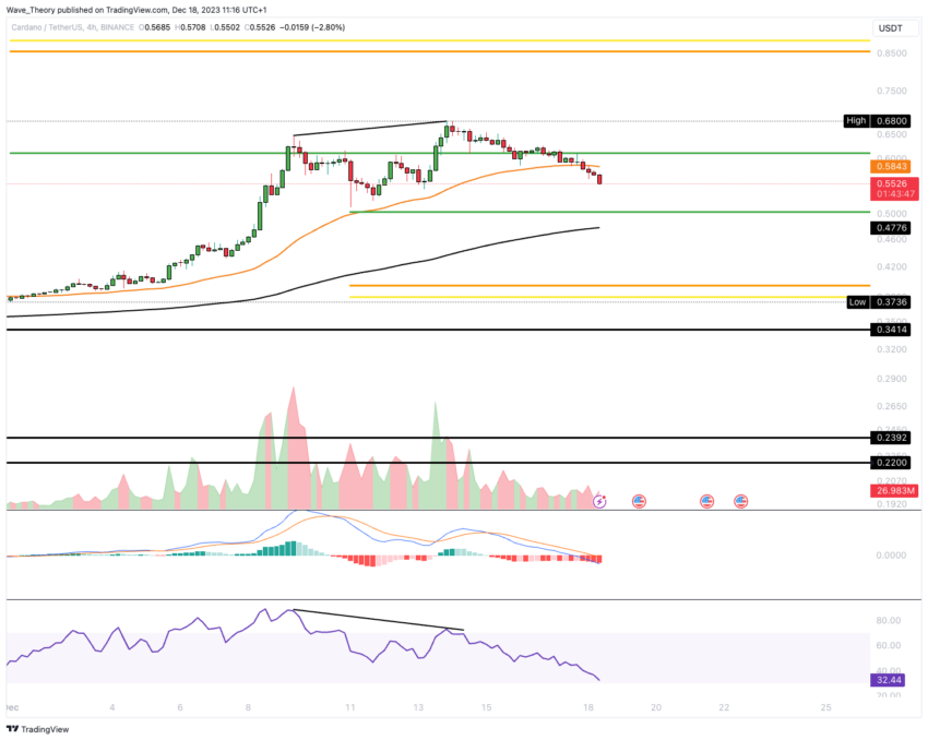 Actuellement, le RSI s’approche du territoire de survente, ce qui suggère que le mouvement de baisse pourrait être proche d’un point où un renversement pourrait se produire. Compte tenu de ces conditions, il est possible que Cardano trouve un soutien et rebondisse potentiellement au niveau de soutien de Fibonacci (Fib) de 0,382, qui est d’environ 0,5 $, à court terme.