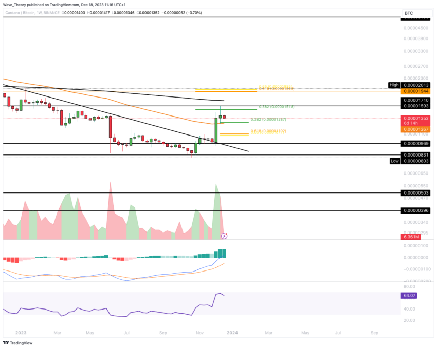 La semaine dernière, dans ses échanges contre le Bitcoin (BTC), ADA a fait face à un rejet baissier au niveau 0,382 Fibonacci (Fib), approximativement à 0,000015 BTC. Suite à ce rejet, Cardano rencontre maintenant un support significatif au niveau Fib de 0,382, coïncidant avec la moyenne mobile exponentielle (EMA) de 50 semaines, autour de 0,0000127 BTC.