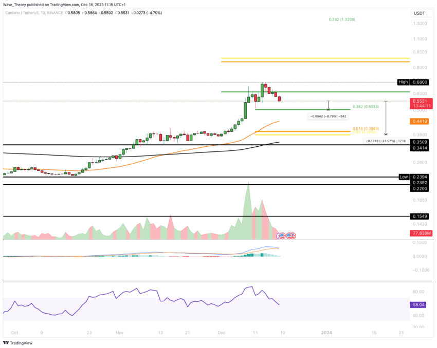 Si l’ADA subit une correction jusqu’au niveau de support de Fibonacci (Fib) de 0,382 à environ 0,5 $, cela représenterait une baisse potentielle d’environ 10 %. Alternativement, une correction jusqu’au support du ratio d’or à environ 0,39 $ impliquerait un potentiel de baisse plus important de plus de 31 %.