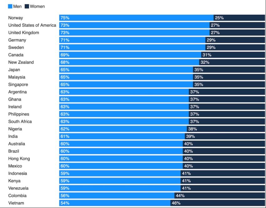 “En moyenne 36 % [des investisseurs crypto] sont des femmes, alors que 64 % sont des hommes. La Norvège présente le plus grand écart, 75 % des investisseurs crypto norvégiens  étant des hommes. Le Vietnam arrive en tête de liste en termes de parité [54 % d’hommes contre 46 % de femmes]”.