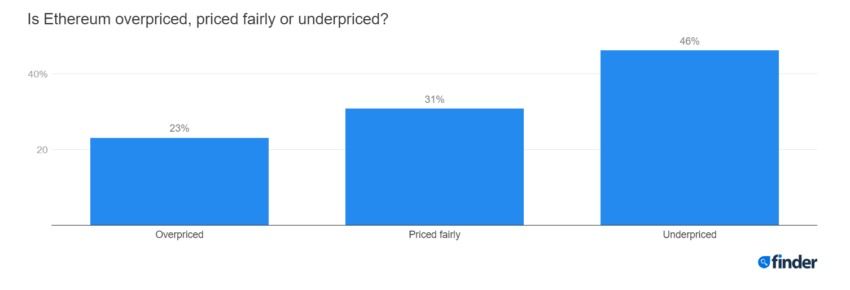 Prédictions cours Ethereum : selon 46% des panélistes d’une étude menée par Finder, ETH serait sous-évalué depuis The Merge.