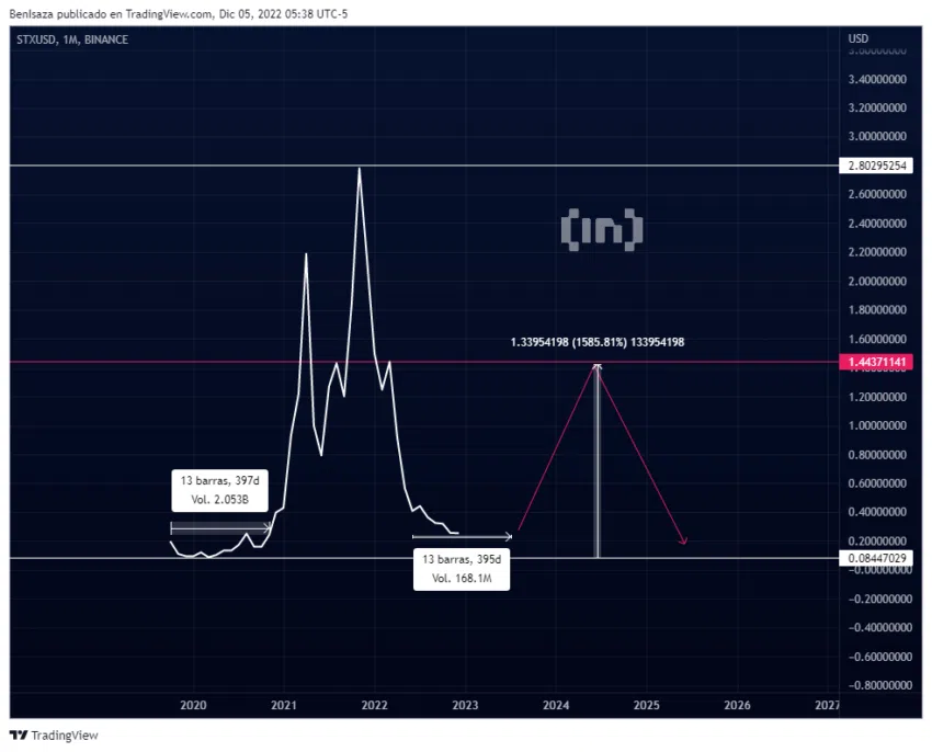 Le cours du token STX pourrait revenir à ses creux enregistrés en 2020, formantalors une structure de fourchette d’accumulation d’approximativement 130 – 140 jours. Selon notre thèse technique de bulltrap théorique, cet actif pourrait connaître une hausse de 1 500 % avec un objectif de 50 % de Fibonacci.