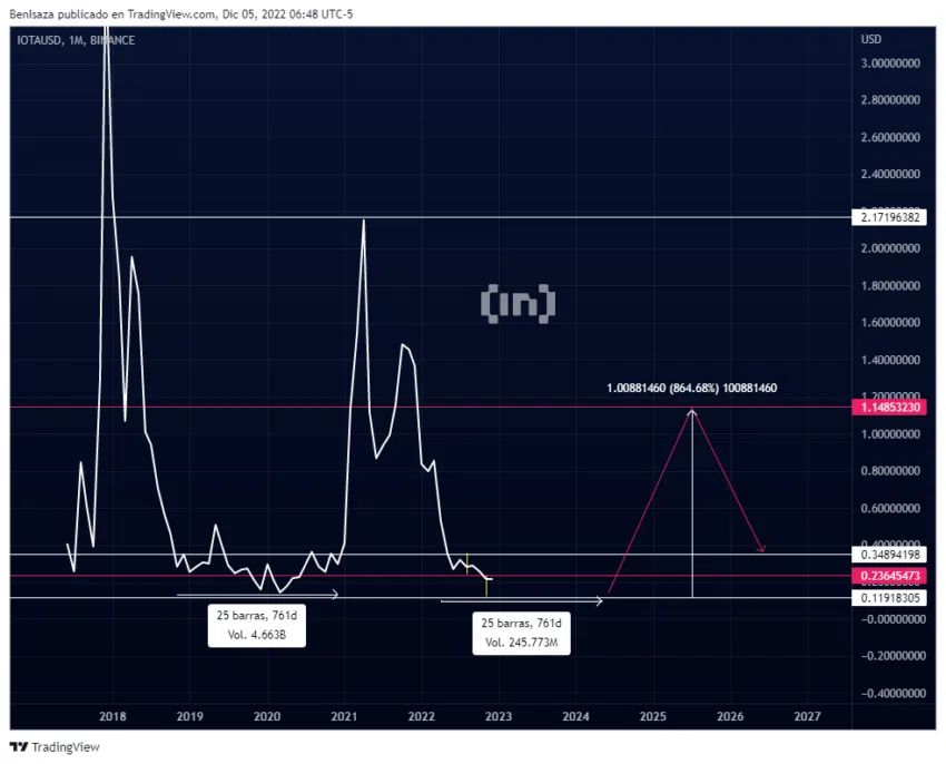 Le cours de la crypto IOTA pourrait revenir aux creux enregistrés en 2020, formant une fourchette d’accumulation d’environ 761 jours.