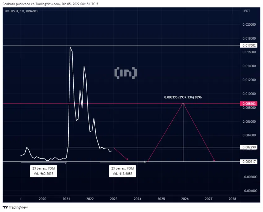 Le cours du token HOT pourrait revenir à ses creux enregistrés en 2020, formant ainsi une fourchette d’accumulation d’environ 700 jours. Selon notre thèse technique théorique du bulltrap, cet actif pourrait connaître une hausse de 3 900 % avec un objectif de Fibonacci de 50 %.