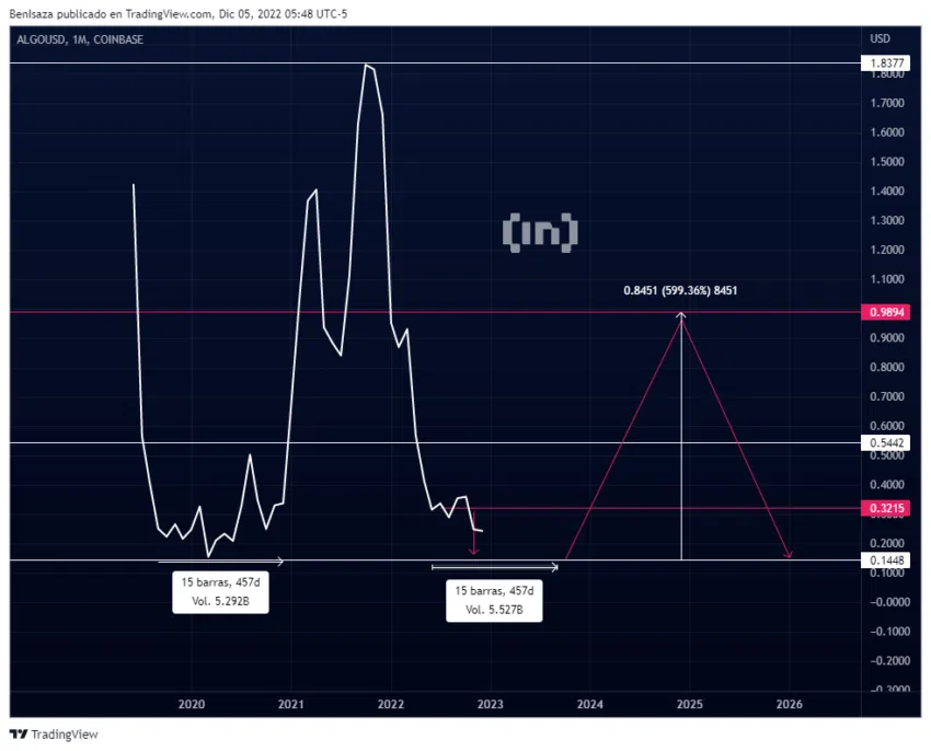 ALGO pourrait revenir à ses creux enregistrés en 2020, formant alors une structure de fourchette d’accumulation d’approximativement 457 jours.