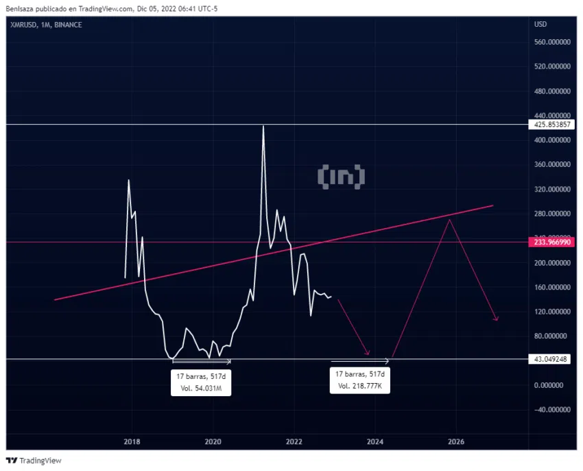 Le cours de la crypto XMR pourrait revenir à son niveau minimum de 2020, formant alors une zone d’accumulation baissière d’environ 517 jours.