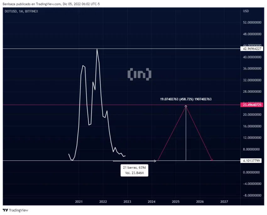 Le cours du DOT pourrait revenir à ses creux minimums atteints en 2020, formant une fourchette d’accumulation d’environ 640 jours. Selon la thèse technique du bulltrap, cet actif pourrait connaître une hausse de 460 % avec un objectif Fibonacci de 50 %.
