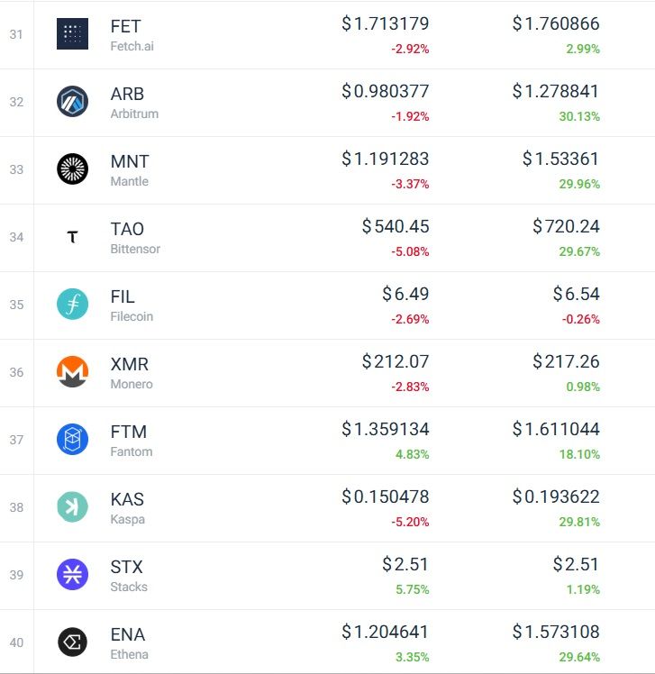 Enfin, les prédictions crypto sont également positives pour les actifs allant de la 30ème à la 40ème position par market cap. Plusieurs hausses sont attendues avec jusqu’à 30,13 % espéré pour ARB.