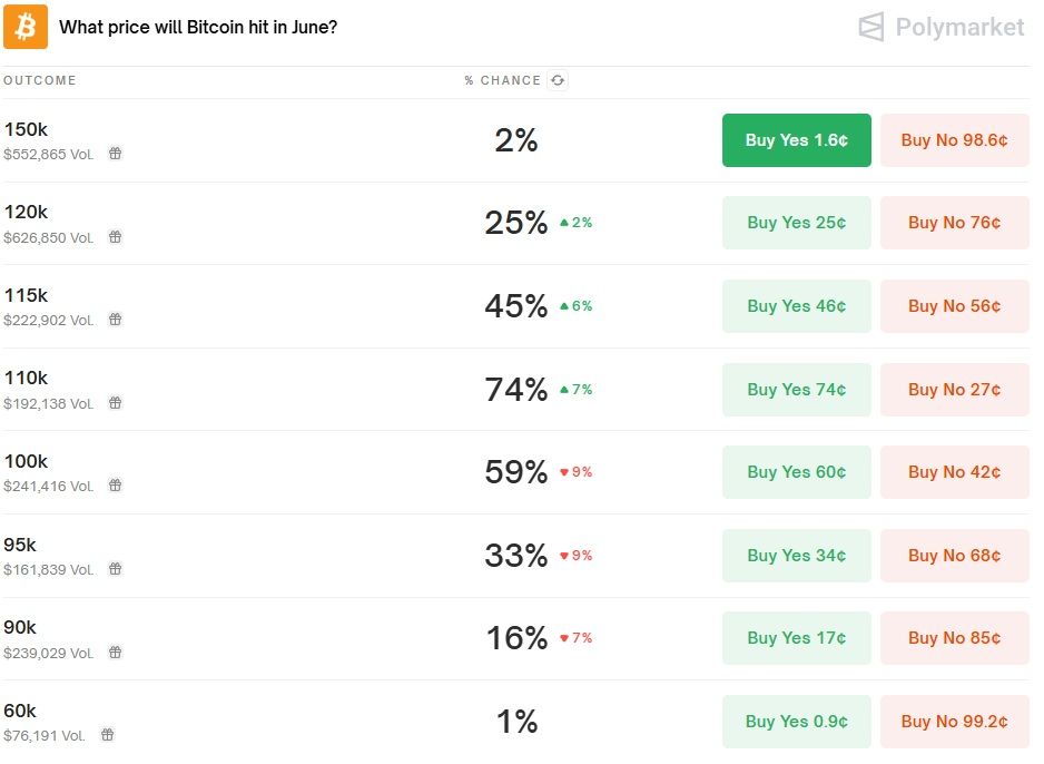 Le sixième mois de l’année a débuté et les attentes se renouvellent concernant le BTC et ETH. Voici les prédictions de prix des parieurs de Polymarket.