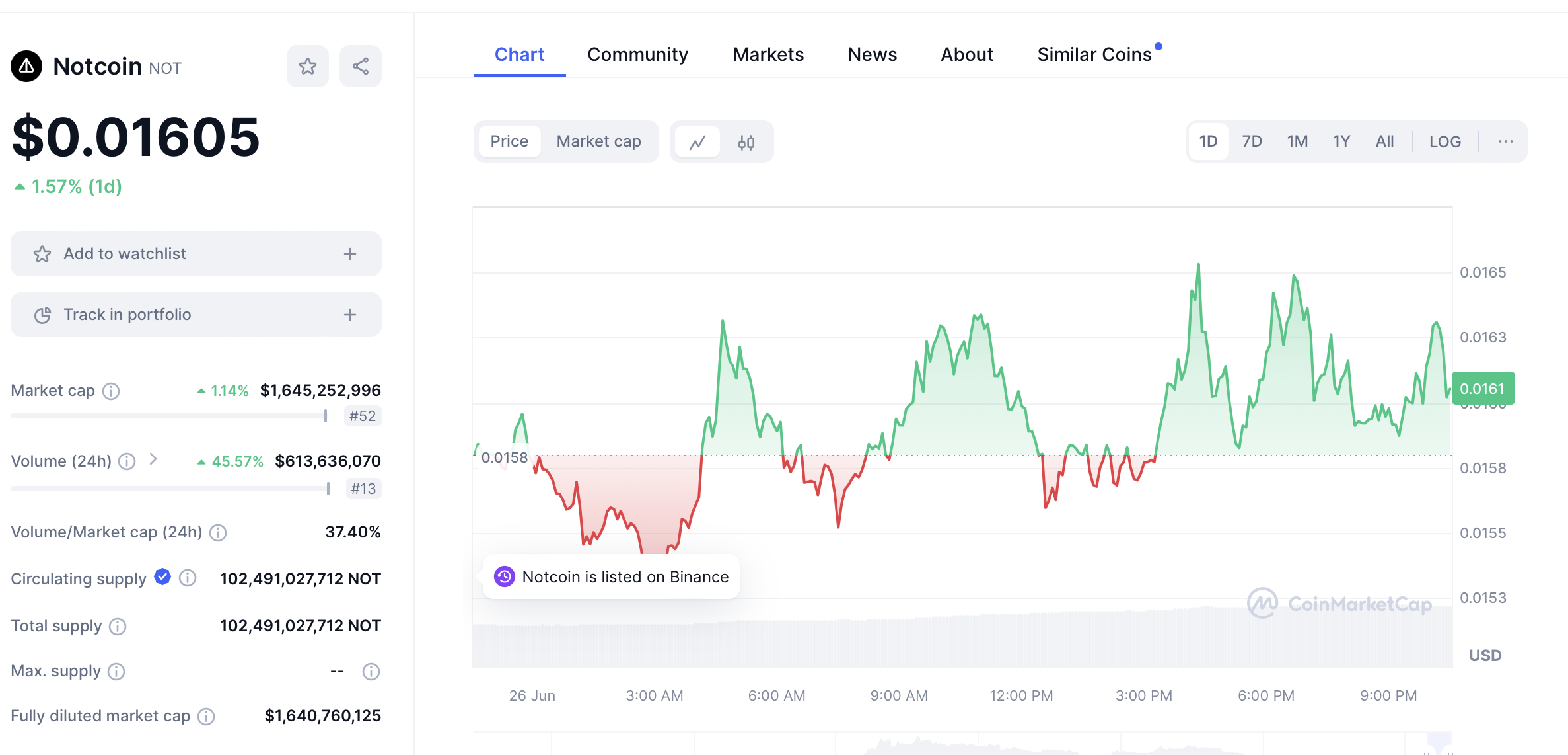 Malgré ces deux annonces, le cours de Notcoin n’a progressé que de 1,57 % sur les dernières 24 heures. Cependant, un fait intéressant est à noter : le volume de trading du NOT est en forte augmentation. Les données de CoinMarketCap montrent que le volume de trading du NOT a bondi de près de 45,57 % pour atteindre 613 millions de dollars en rythme journalier.