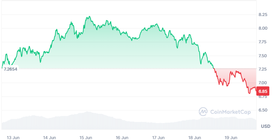 En effet, Toncoin a brisé le support des 7 $ et s’il ne le regagne pas au plus vite, c’est une rechute à 6,50 et 6 $ qui se prépare.