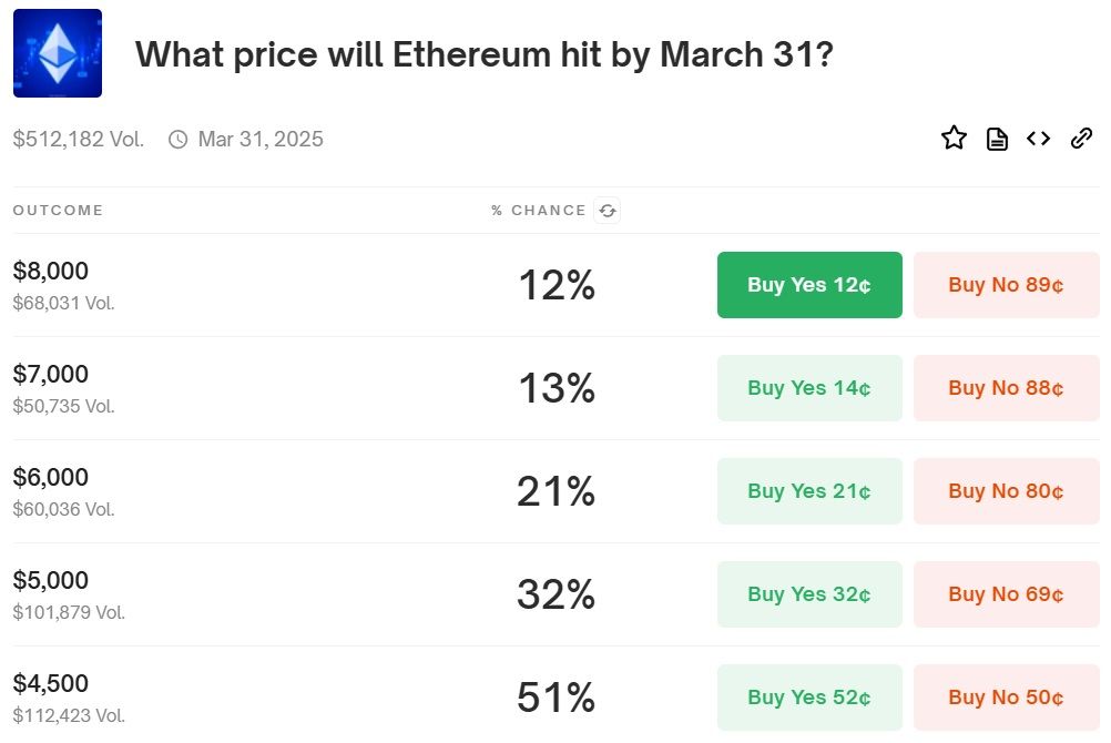 Si la hausse est envisagée du côté du BTC, c’est à peu près pareil du côté d’Ethereum. Si l’on prend en compte les paris en cours sur Polymarket, on s’attend a de la hausse pour le premier trimestre 2025. Mieux encore, un ATH est une grande probabilité comme nous allons le voir en détail.