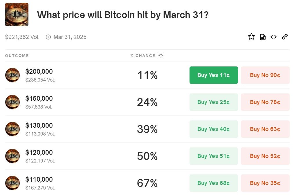 SponsoredAlors que la hausse est encore attendue pour bon nombre d’analystes crypto, les parieurs de Polymarket s’attendent eux aussi à une hausse des prix. Ces derniers sont confiants concernant un dépassement des 110 000 $, des 120 000 $ voire même des 130 000 $ d’ici la fin du premier trimestre (31 mars).