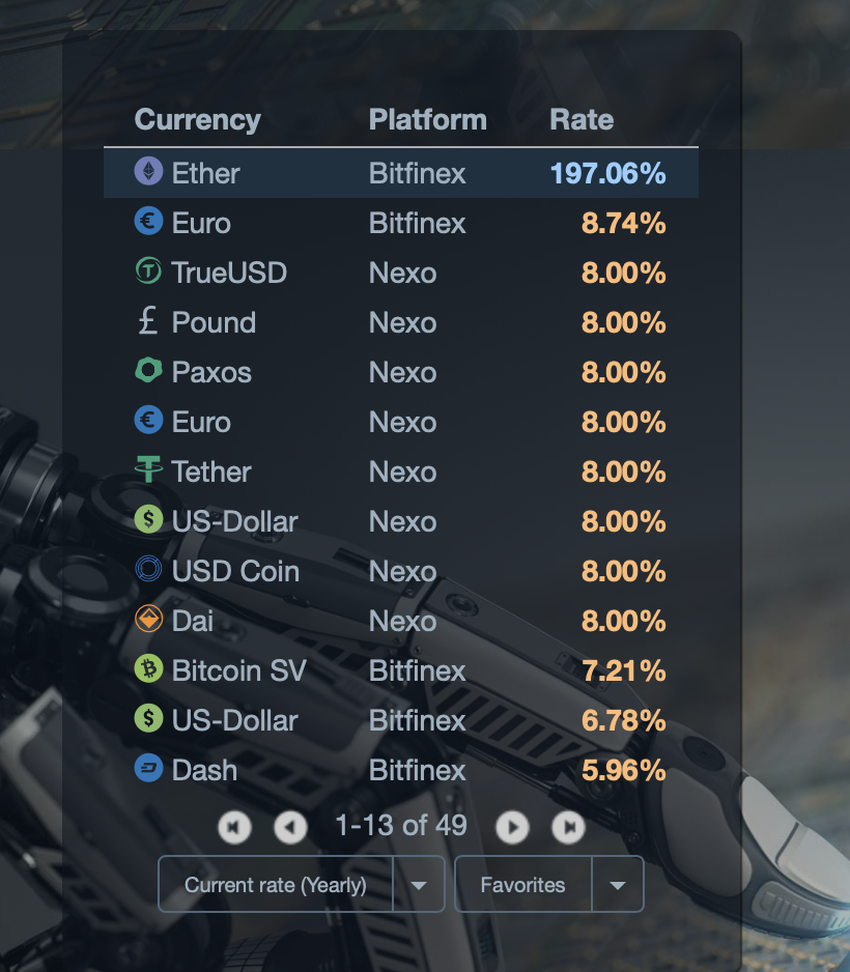 À l’heure actuelle, le taux d’intérêt annualisé pour les ETH sur Coinlend est à un étonnant 197%. Le pic peut être lié aux marges longues pour ETH sur Bitfinex.
