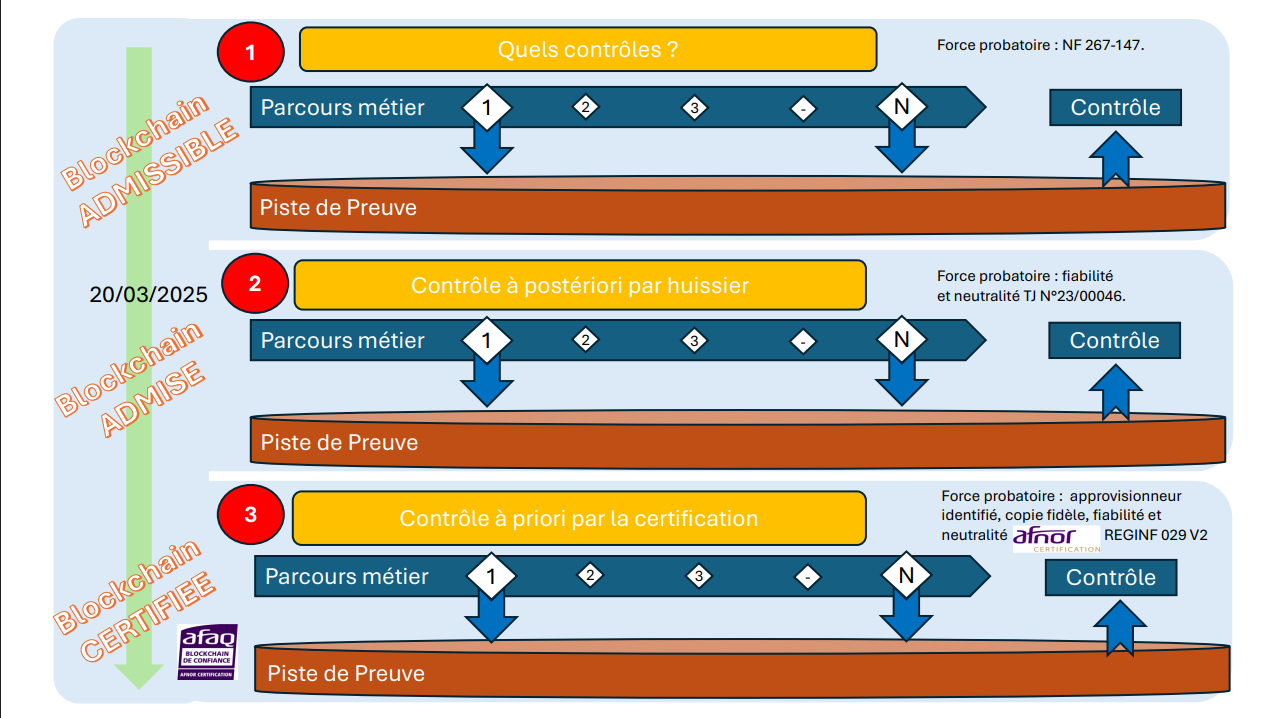 On a désormais aussi un contrôle a priori possible qui devrait faciliter davantage l’adoption de la blockchain comme mode probatoire.
