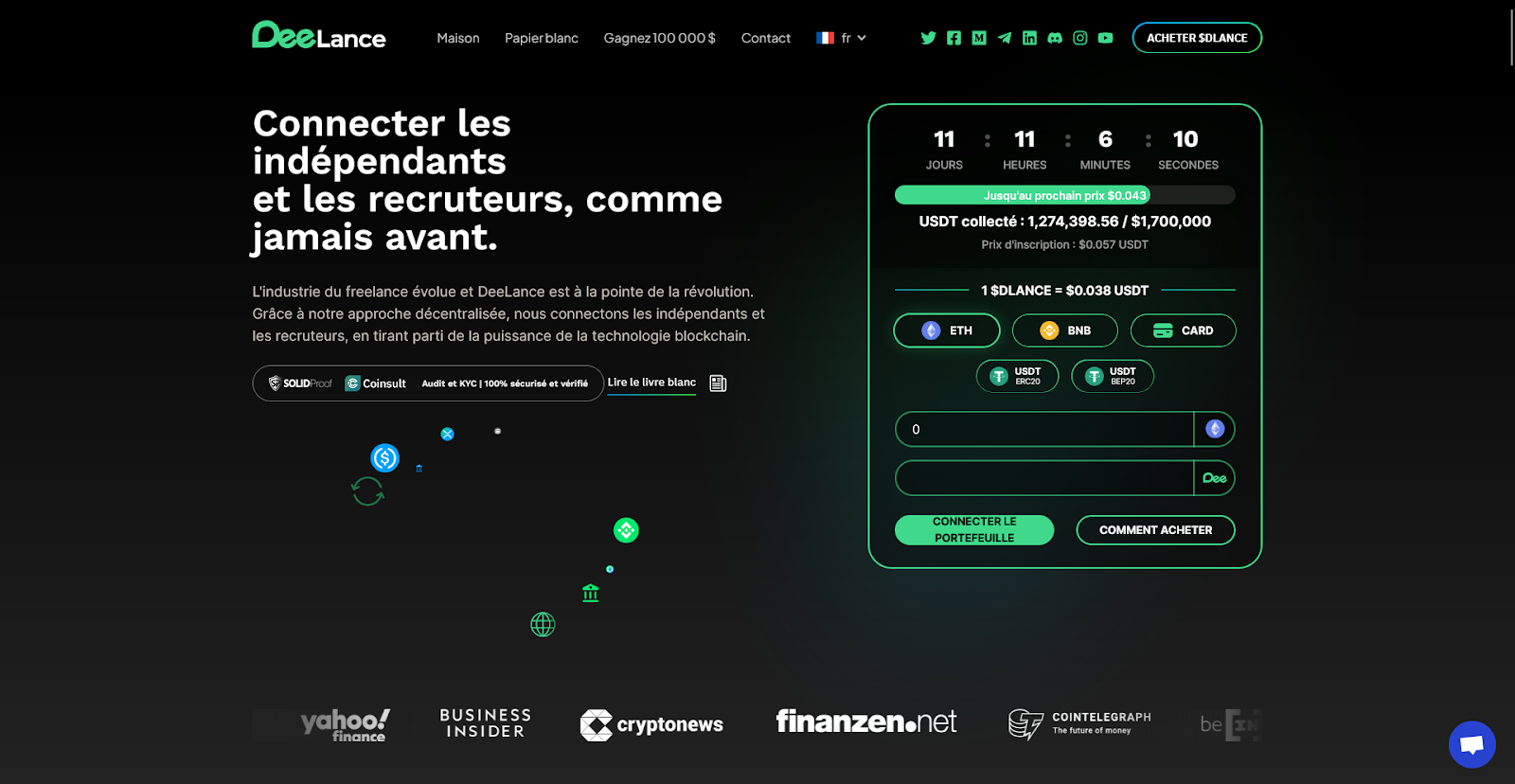 Aujourd’hui, le DLANCE est proposé au prix de 0.038$. Il est possible de découvrir le projet en se rendant sur le site officiel de Deelance et en connectant son wallet. L’échange peut être réalisé via ETH, USDT ou BNB. Une option d’achat de cryptos par carte de crédit est également disponible pour les investisseurs n’ayant aucune crypto.