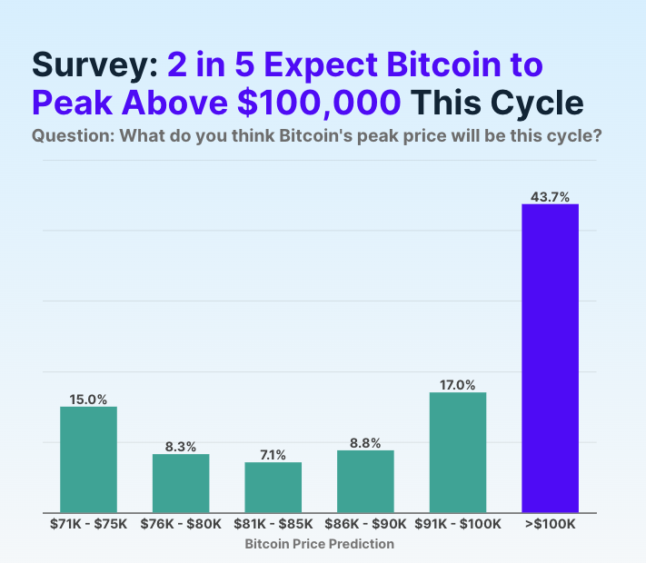 Près de 43,7 % des fans de cryptomonnaies interrogés au cours de ce sondage estiment que Bitcoin pourrait franchir le seuil des 100 000 $ lors du cycle actuel, témoignant ainsi d’un optimisme marqué sur le marché.