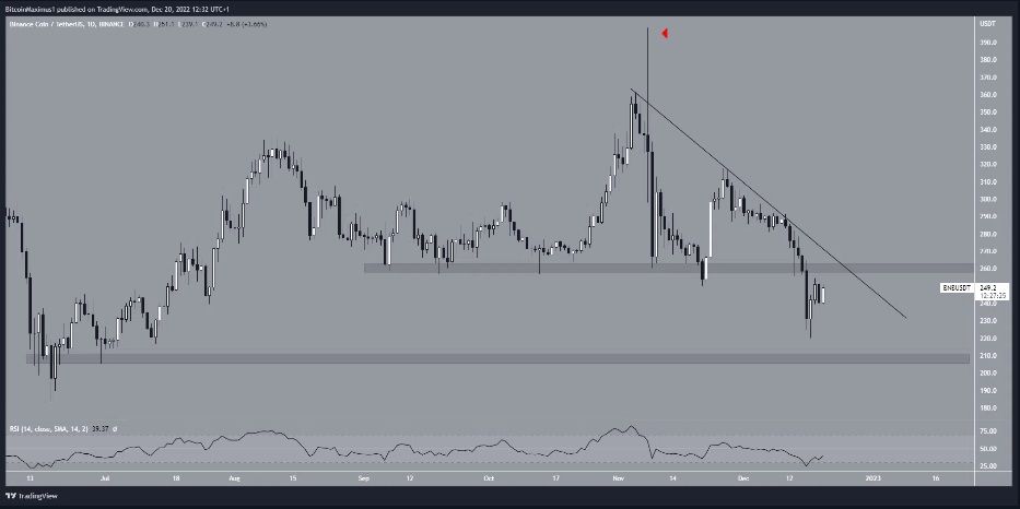 BNB est le jeton natif de l’exchange crypto Binance et de sa BNB Chain. Le prix du BNB a diminué sous une ligne de résistance descendante depuis qu’il a atteint un sommet de 398,30 $ le 3 novembre. Le même jour, il a créé une mèche supérieure massivement longue (icône rouge). Le mouvement à la baisse a conduit à un plus bas de 220 $ le 17 décembre et a provoqué une rupture de la zone de support horizontale de 260 $.