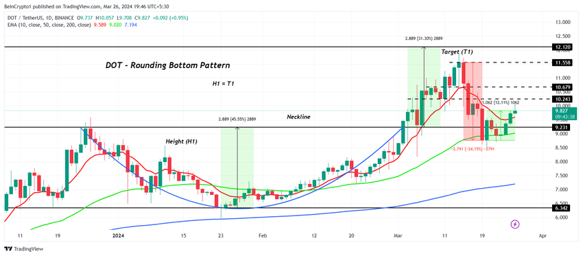 Les indices haussiers suggèrent que le prix de Polkadot est certainement sur la voie de la reprise. En conséquence, il pourrait continuer à augmenter. Au cours des dernières semaines, le DOT a généré une figure d’inversion haussière. Cette dernière laissait même suggérer un rallye potentiel de 31 %. Ainsi, l’objectif de prix pour la crypto est de 12 $.