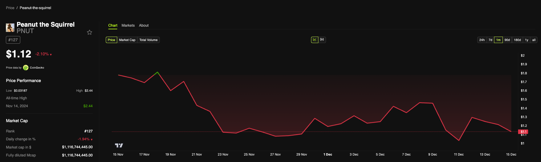 Malgré la bataille juridique, la réaction du marché a été relativement modérée. Le token Peanut the Squirrel (PNUT) n’a que légèrement diminué en valeur avec une baisse de 2,10 % au cours des dernières 24 heures, se négociant actuellement à 1,12 $.